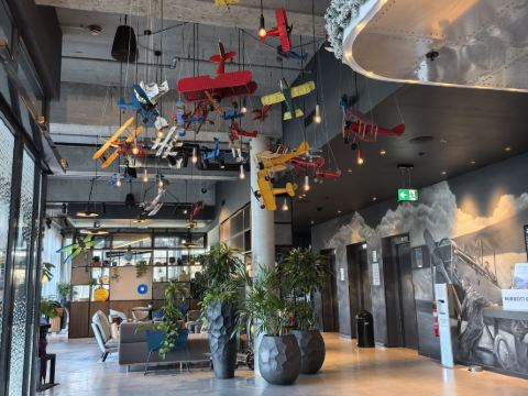 The MOXY Berlin Airport is literally a 5-minute walk from the terminal – perfect for early flights or late arrivals. The vibe is young, fun, and modern with colorful decor, a cool bar/lounge area that’s open 24/7, and friendly staff who actually seem to enjoy their job.