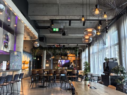Rooms are compact (typical MOXY style) but super smart – comfy bed, powerful shower, fast Wi-Fi, big TV with casting options, and USB ports everywhere. Everything felt clean and new. Breakfast is decent for the price (continental style with good coffee), and they have grab-and-go options if you’re in a rush.