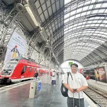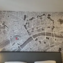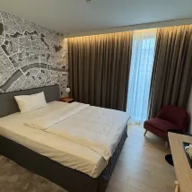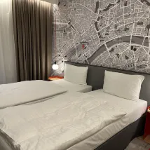 The hotel is conveniently located, just a 2-3 minute walk to the train station. Unfortunately, the area around the station has a lot of graffiti and many homeless people at night, which made us feel a bit uneasy. The room was a bit cramped, and the facilities were comparable to a Chinese 3-star hotel. However, it was clean and had all the necessary amenities. The wall behind the bed featured a large mural of the Frankfurt subway, which was quite a unique touch. You can ask the front desk on the ground floor for slippers and extra towels.