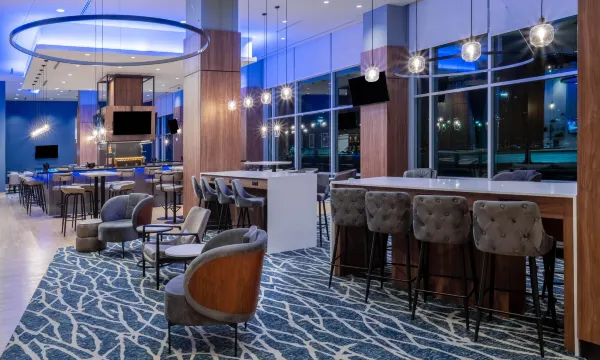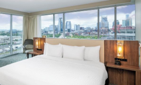 Firstly, it was practically, fantastically 10 minutes' walk into Downtown via the John Seigenthaler Pedestrian Bridge for sights over the Cumberland River of Downtown and the Nissan Stadium. It's been modernised compared to La Quintas elsewhere, but do not order the Onion Rings at the bar (horrid)! the 'dry rubbed wings' were great! Otherwise, the bar and seating/lounge area is welcoming, but I never tried the breakfast.