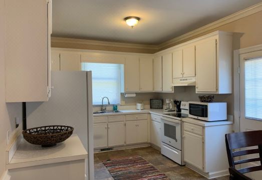 * Stocked with essentials: pots, pans, knives, cutting boards, utensils, salt, pepper, and a spice rack