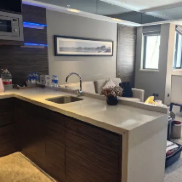 I booked two king-size rooms, and the front desk upgraded one of them to a suite for us. It was great because it could be connected to the other room, which made it easier to take care of our elderly family member. The room facilities were complete; there were a few power outlets, but they provided a power strip, which helped. There was a minor hiccup with the service, but the hotel management responded very proactively. The sea view and room decor were a pleasant surprise; it was incredibly relaxing to take photos by the window. For lunch on the second day, we ordered takeout and ate together in the room, which felt just like home!