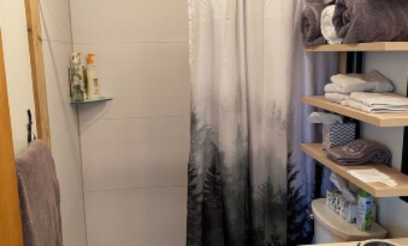 A recliner, loveseat and dining table at the lakeside windows allow you to view the Lake or enjoy the TV and wood-burning fireplace in the high-ceiling living area. Because this is one of only ten units which have chosen to retain the original wood-burning fireplace, please be aware that guests must provide their own firewood to enjoy this feature. A king size bed and new walk-in shower ensure a comfortable stay. There is even a fully equipped open kitchen with a large prep peninsula tucked in a corner of the living area and the deck contains a grill and table for outdoor cooking and dining. Lakeside Lair may be small, but it’s specifically designed to be the perfect getaway place for one or two. Everything you need….and nothing you don’t.