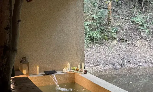 主推的那個私湯,是在主體院子裏的林中高處,是一座單獨的房子,泡湯處面向樹林,沒窗户,營造氛圍感是與大自然一體的感覺,需要帶游泳衣哦!泡湯需要預訂,每天7個時段,如果定在白天可以看風景。
