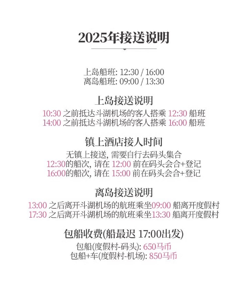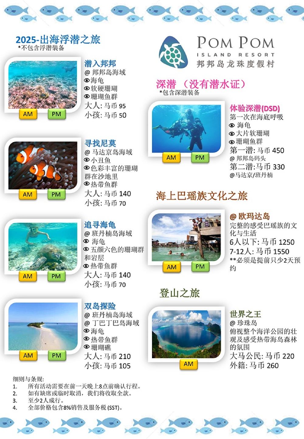 1. Round-trip transfers between Tawau Airport and Semporna Jetty, approx. 70 min. (Pom Pom Island Resort stipulates airport-to-Semporna transfers are only provided on arrival/departure days; next-day transfers require an additional MYR 300 one-way fee);