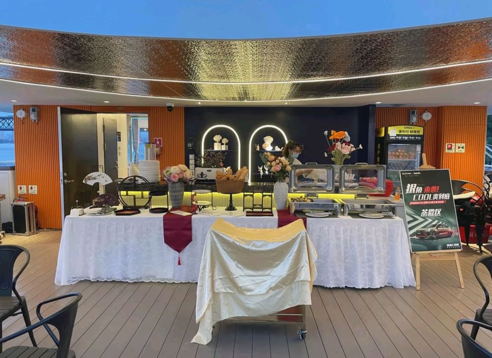 - The refreshment break area inside the cruise is exquisitely arranged, with food displays and fresh flowers on the dining tables, creating a warm and elegant atmosphere.