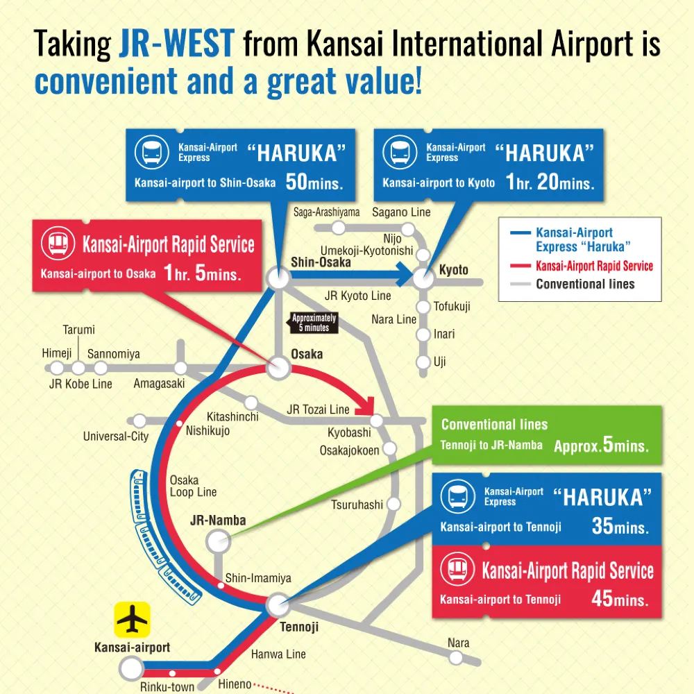Departing from Kansai Airport Station, it takes approximately 35 minutes to reach Tennoji, about 50 minutes to Shin-Osaka, and around 80 minutes to Kyoto, offering exceptionally convenient transportation services.