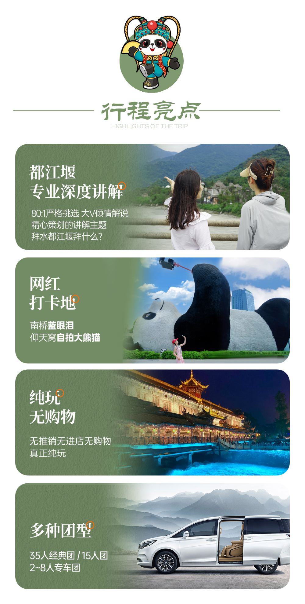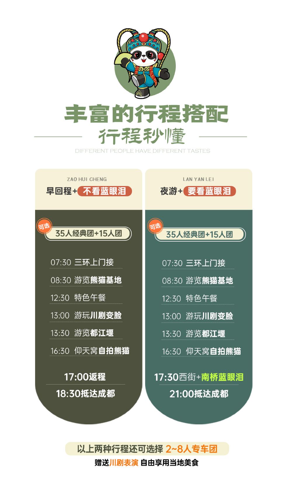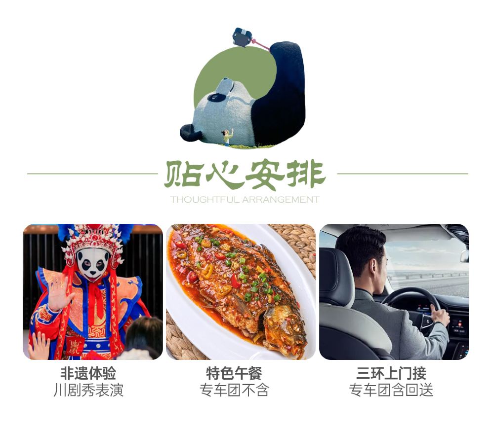In the morning, we were picked up by a car and taken to the same departure point. The itinerary was well-organized, but seeing the pandas in Panda Valley sometimes required some luck 😇, as some would hide and sleep. We had lunch and then headed to Dujiangyan in the afternoon. We were taken up the mountain by car and then walked down, which was more physically demanding than a hike. We then had a few hours of free time in the afternoon to explore, eat, and explore. In the evening, we went to see the Blue Tears before being transferred back to Chengdu. There were explanations and directions throughout the trip, and the itinerary was quite tight, making good use of our time.