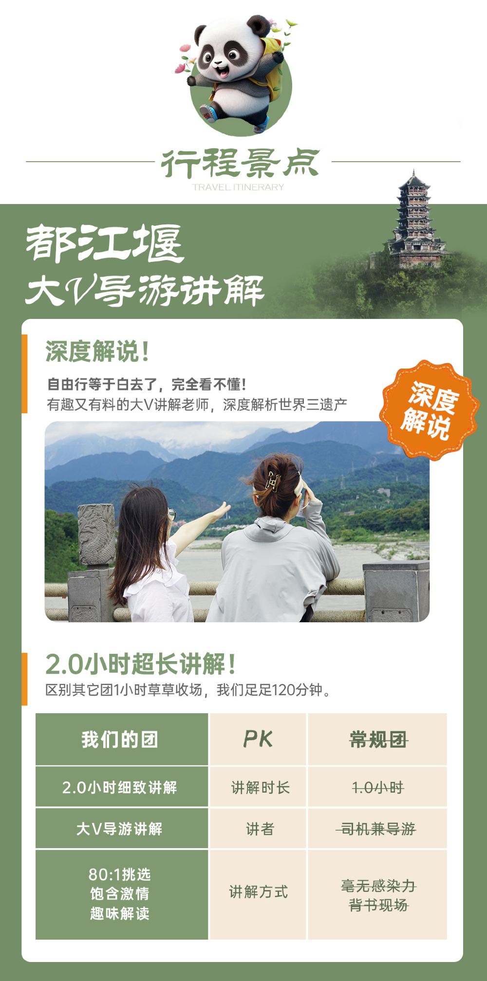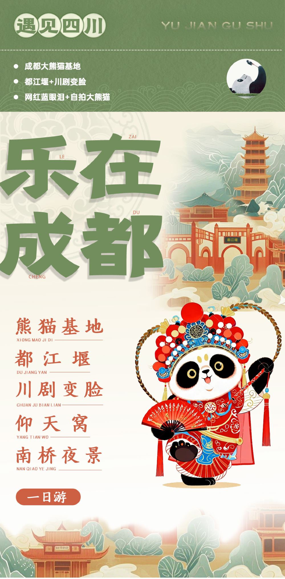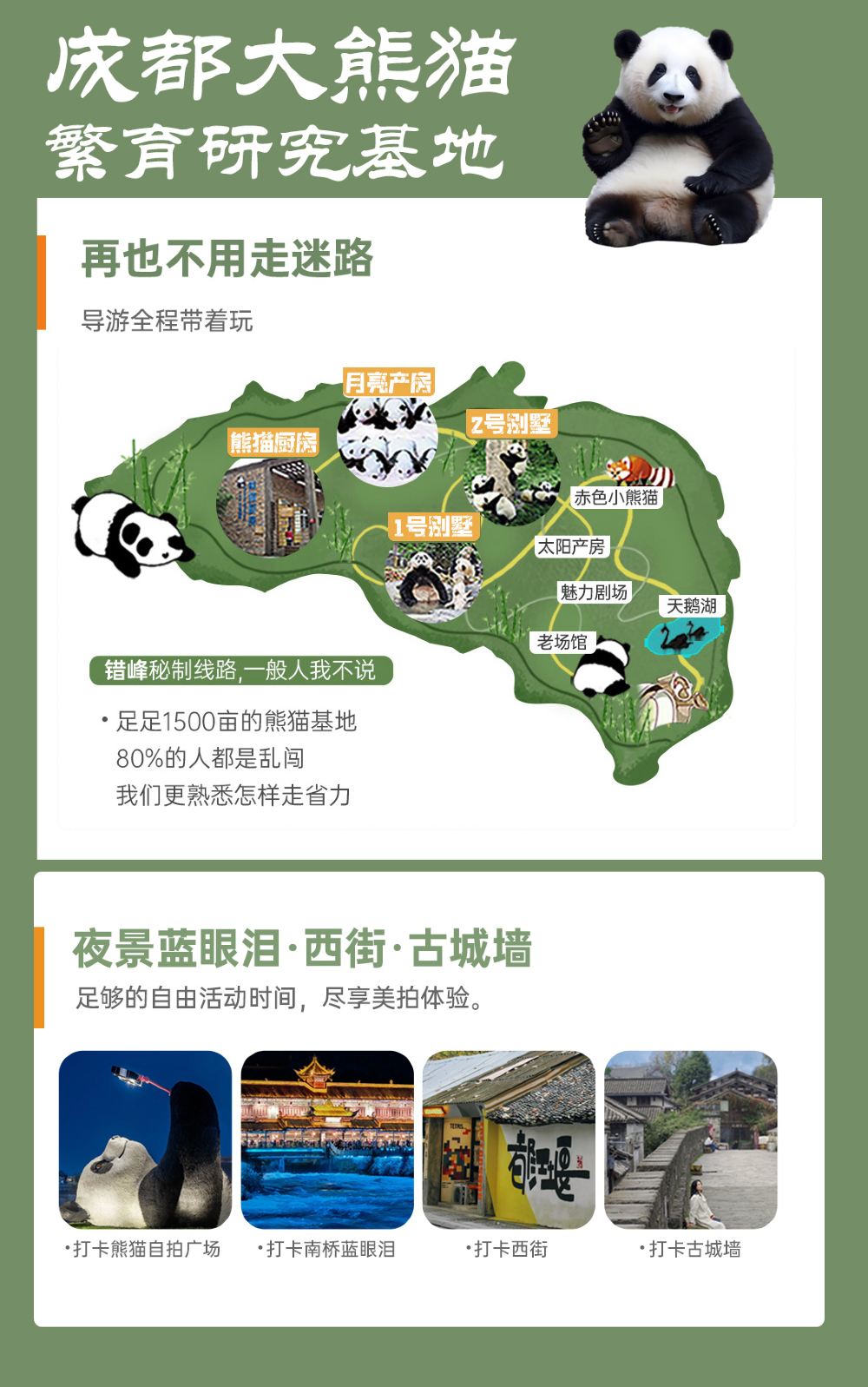 In the morning, we were picked up by a car and taken to the same departure point. The itinerary was well-organized, but seeing the pandas in Panda Valley sometimes required some luck 😇, as some would hide and sleep. We had lunch and then headed to Dujiangyan in the afternoon. We were taken up the mountain by car and then walked down, which was more physically demanding than a hike. We then had a few hours of free time in the afternoon to explore, eat, and explore. In the evening, we went to see the Blue Tears before being transferred back to Chengdu. There were explanations and directions throughout the trip, and the itinerary was quite tight, making good use of our time.