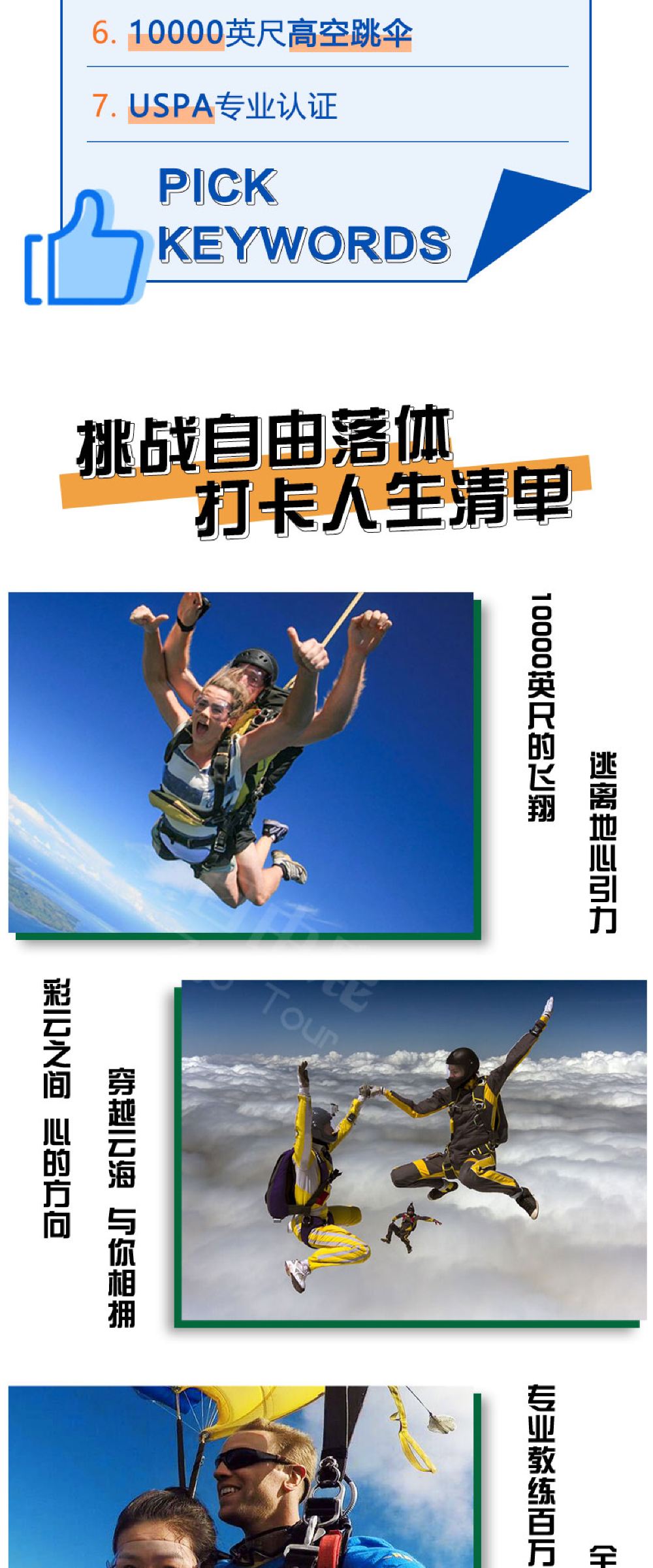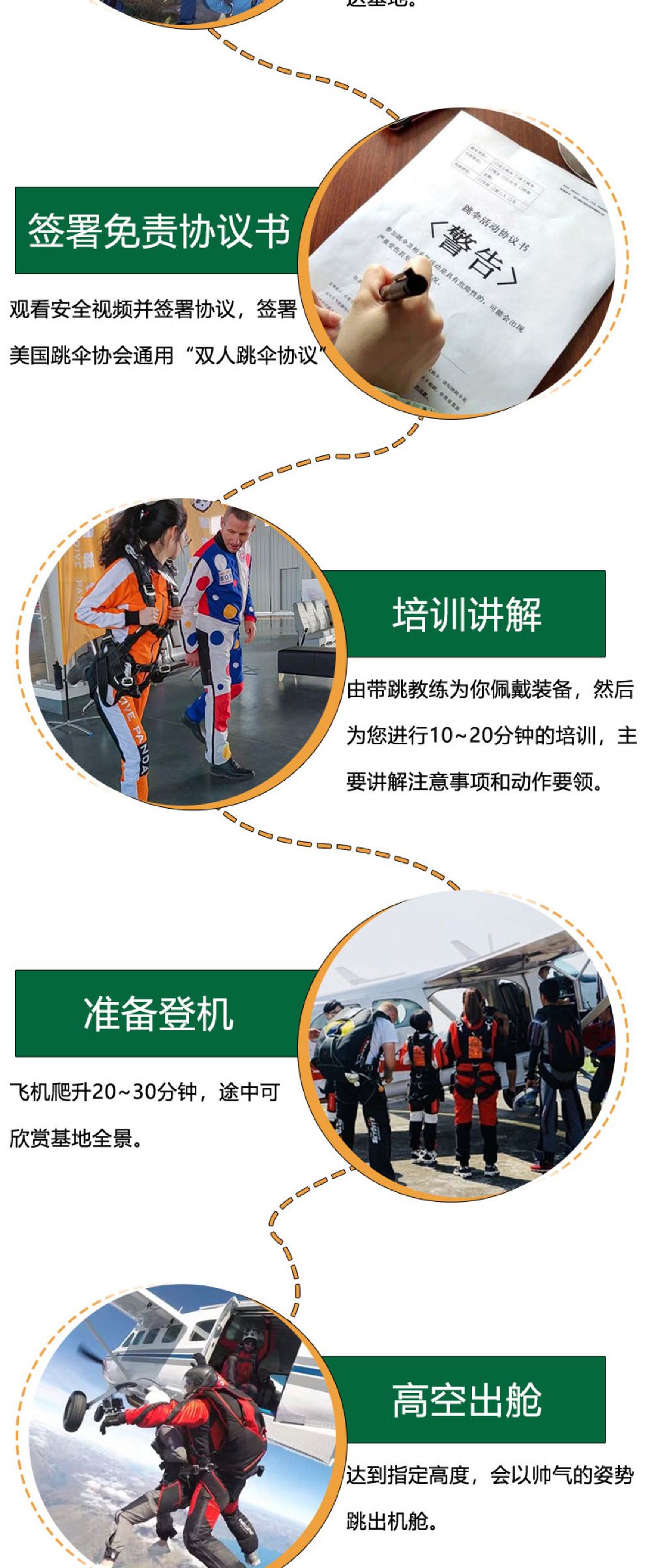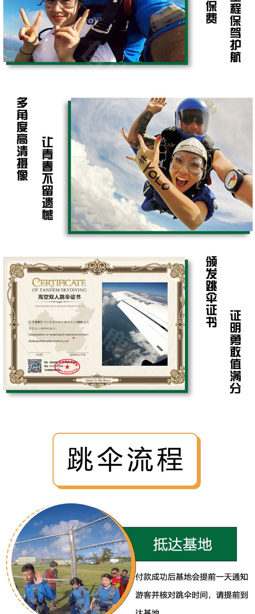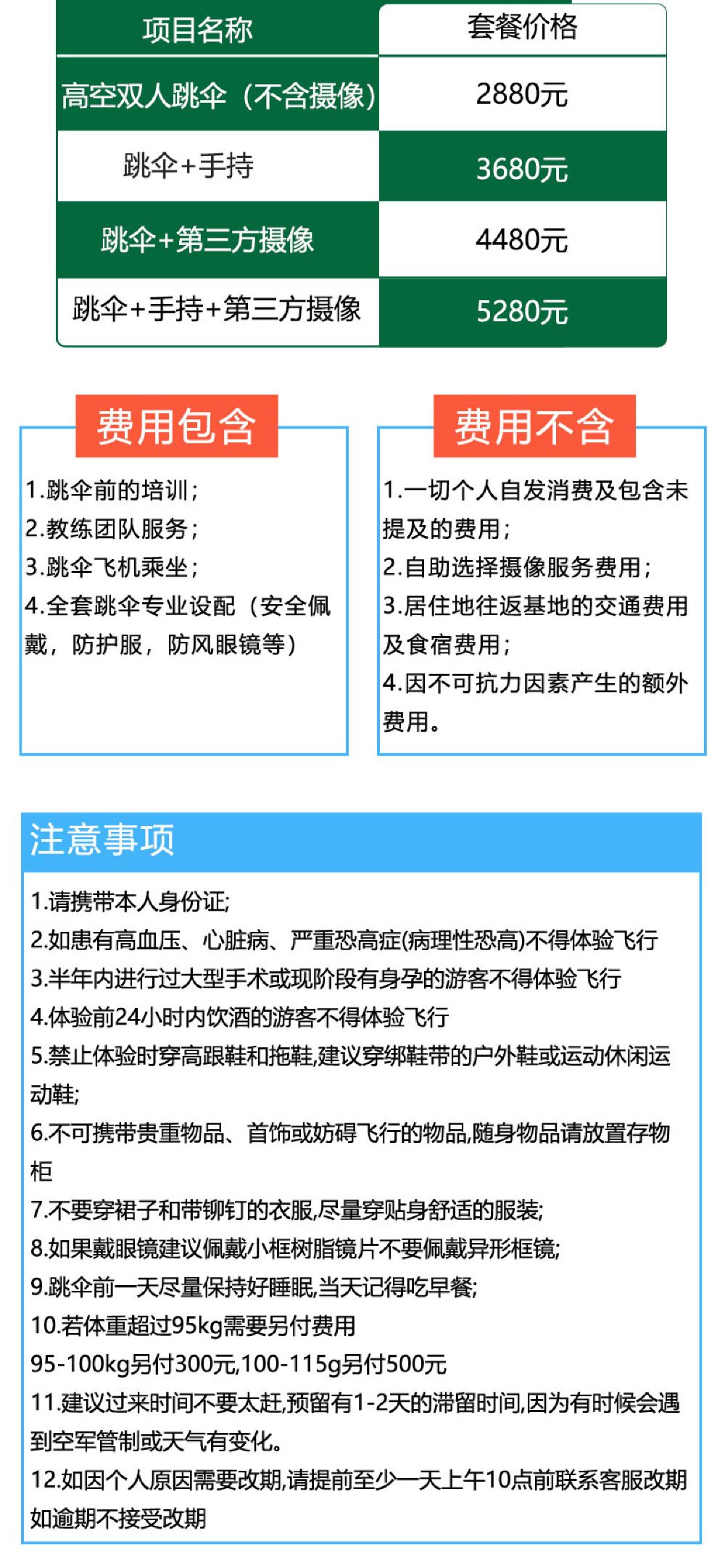 6. It is recommended not to consume excessive alcohol the night before skydiving and avoid eating too much before the activity. Skydiving is not allowed within 24 hours after diving. Pregnant women, individuals with a history of heart or brain diseases, severe hypertension, or other special conditions cannot participate in skydiving activities. If feeling unwell during the activity, please inform the instructor immediately.