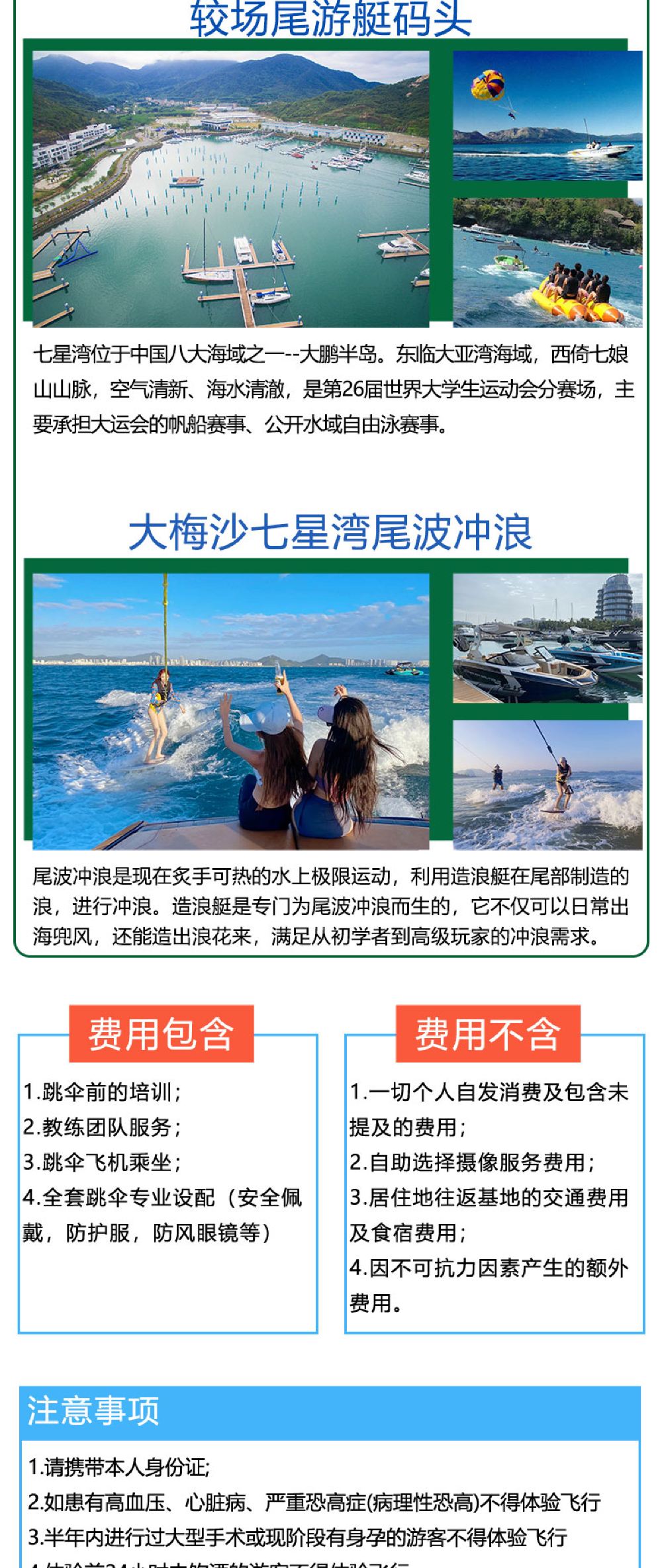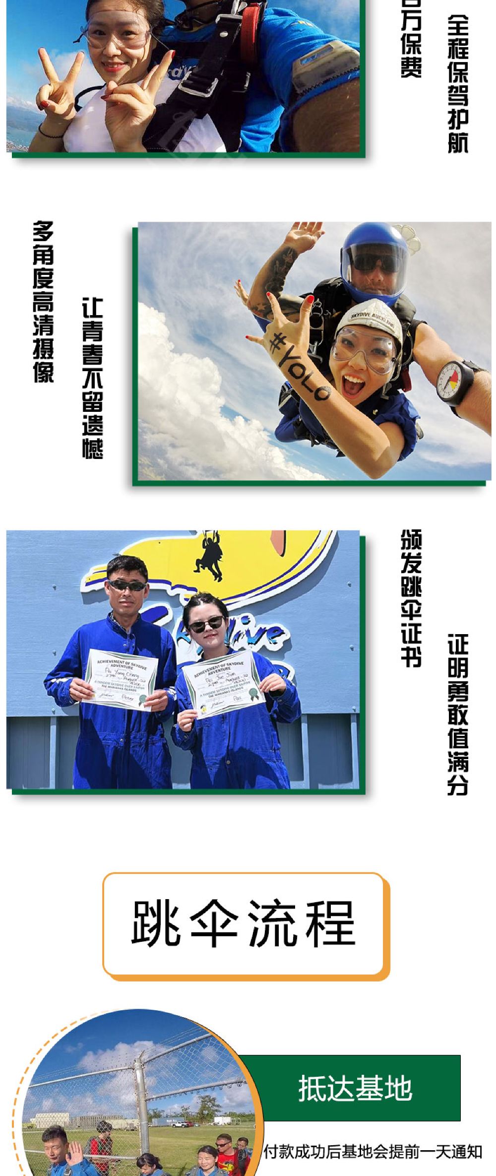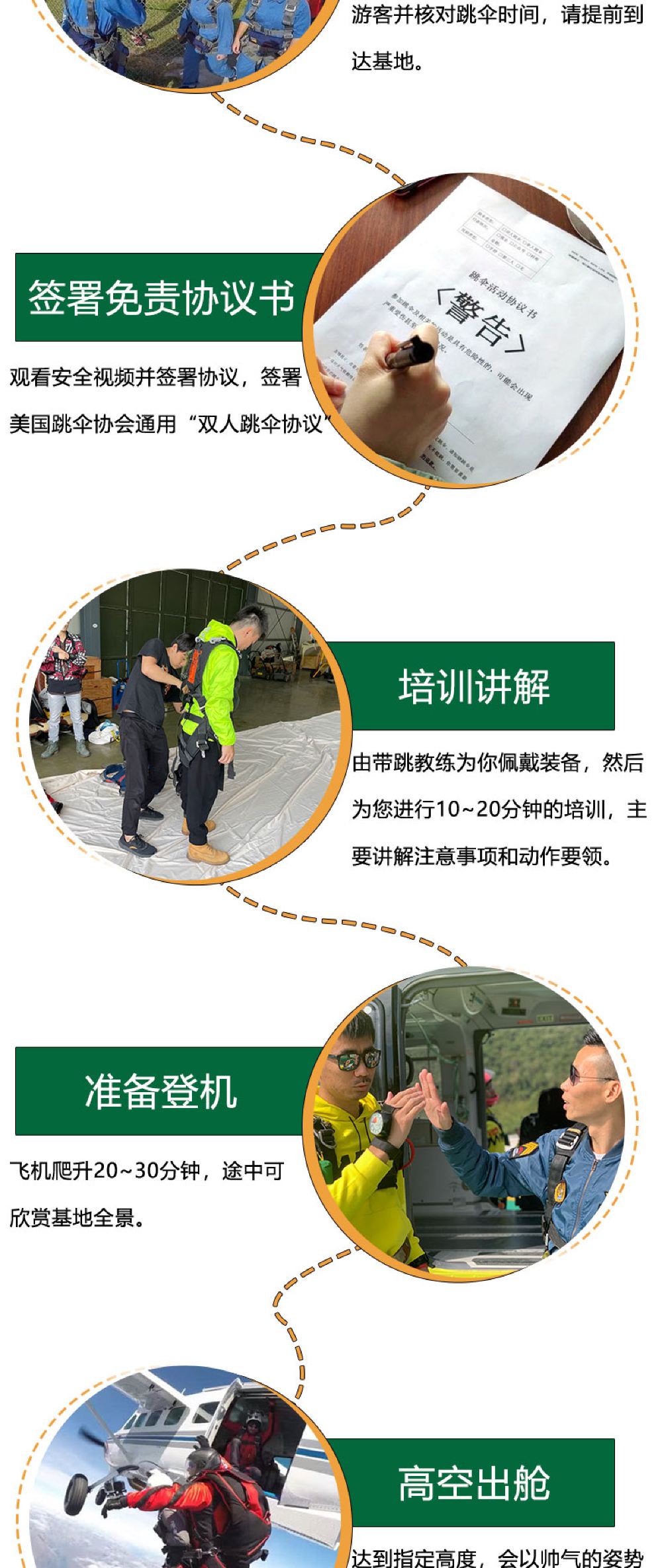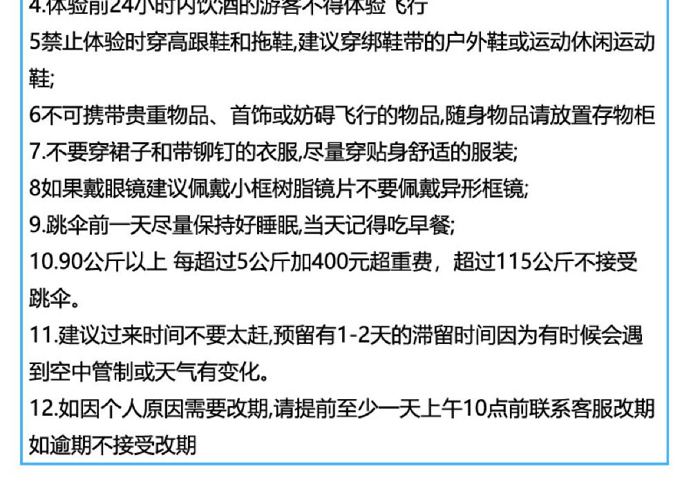 6. It is recommended not to consume excessive alcohol the night before skydiving and avoid eating too much before the activity. Skydiving is not allowed within 24 hours after diving. Pregnant women, individuals with a history of heart or brain diseases, severe hypertension, or other special conditions cannot participate in skydiving activities. If feeling unwell during the activity, please inform the instructor immediately.