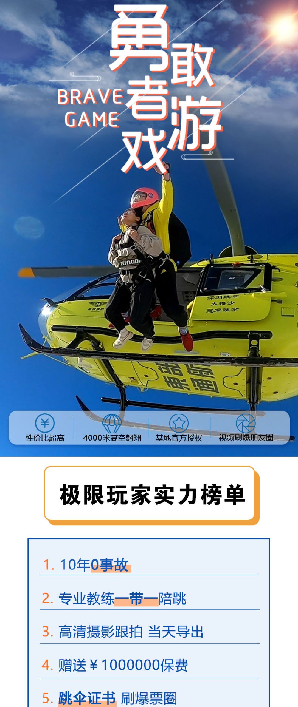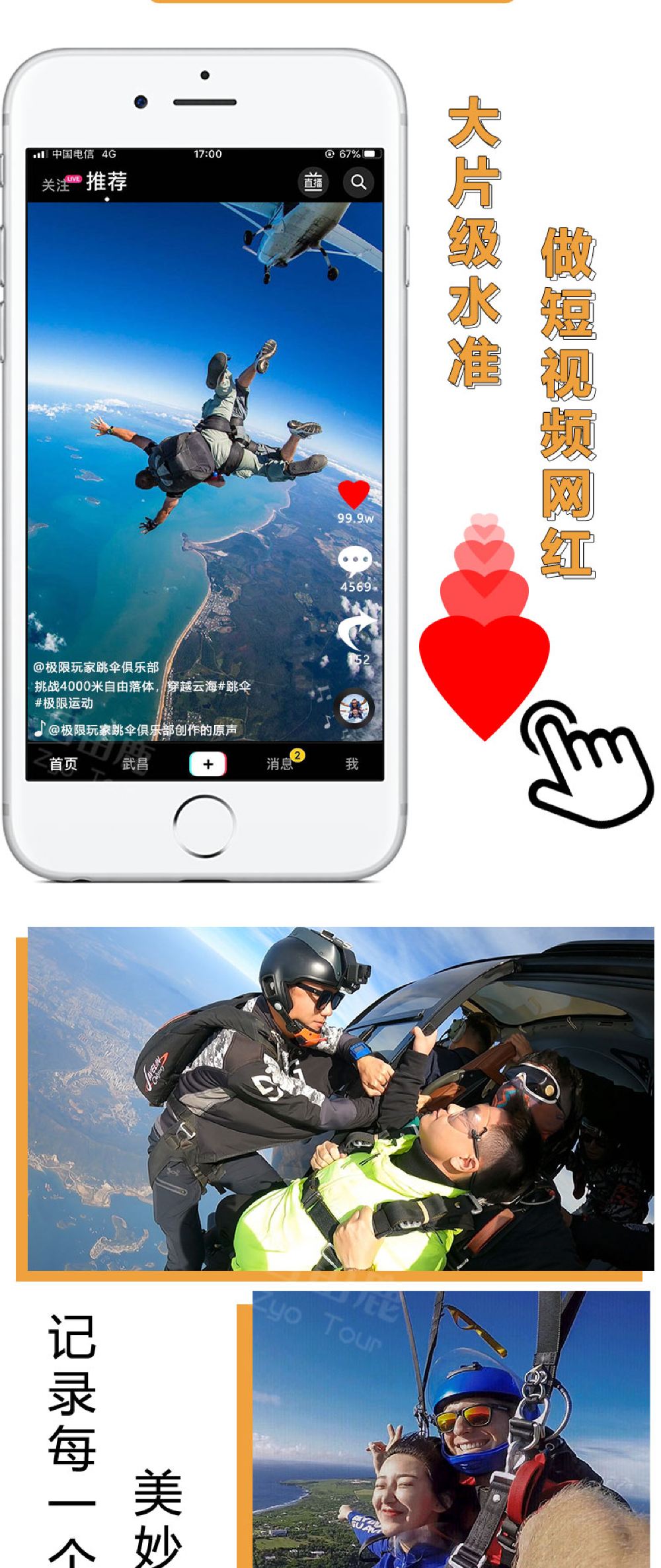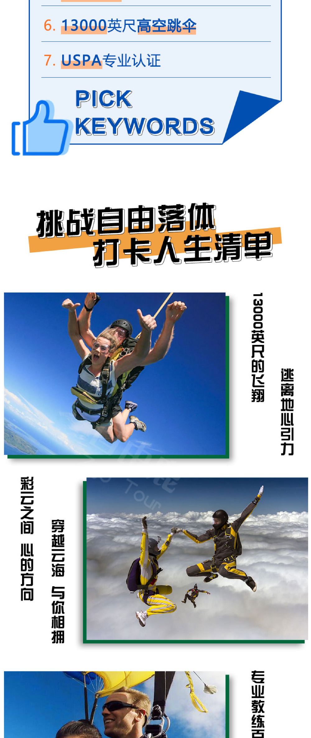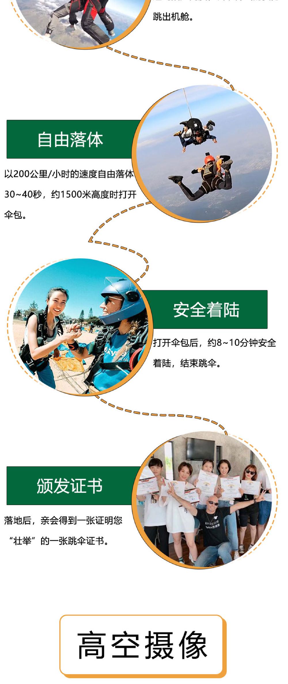 6. It is recommended not to consume excessive alcohol the night before skydiving and avoid eating too much before the activity. Skydiving is not allowed within 24 hours after diving. Pregnant women, individuals with a history of heart or brain diseases, severe hypertension, or other special conditions cannot participate in skydiving activities. If feeling unwell during the activity, please inform the instructor immediately.
