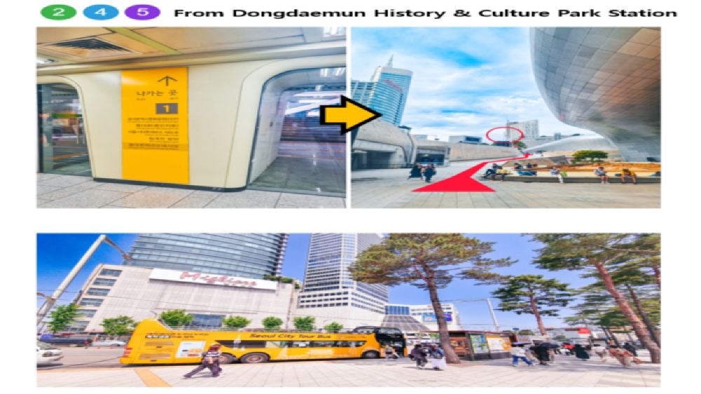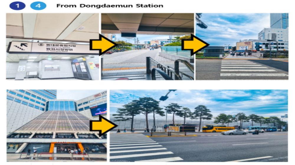 • Exit Dongdaemun Station (Subway Line 1) at Exit 8, cross Cheonggyecheon Stream, and continue straight. Keep the two dozen (items) on your right and walk to the crosswalk on your left. Across the crosswalk, you will see the ticket office with a yellow sign.