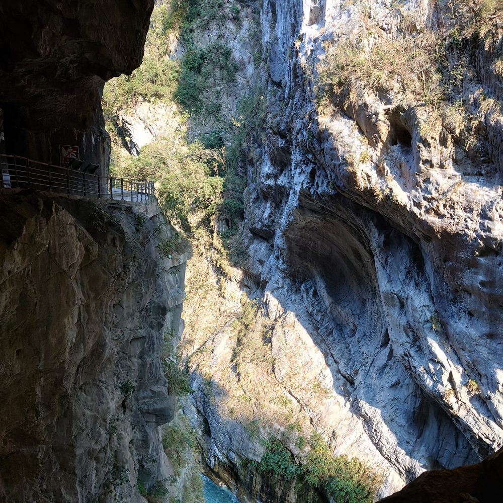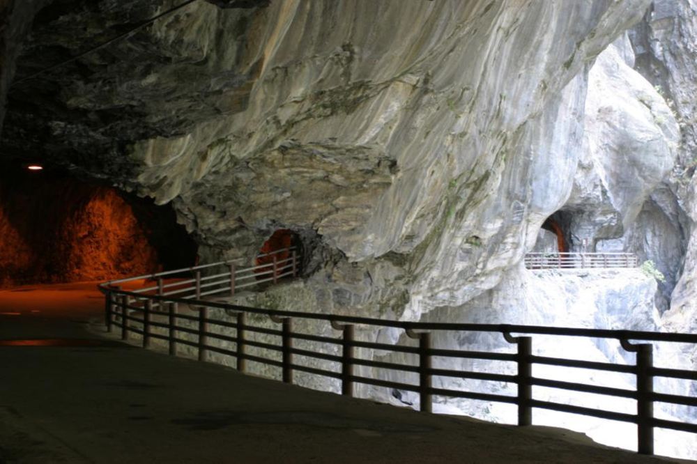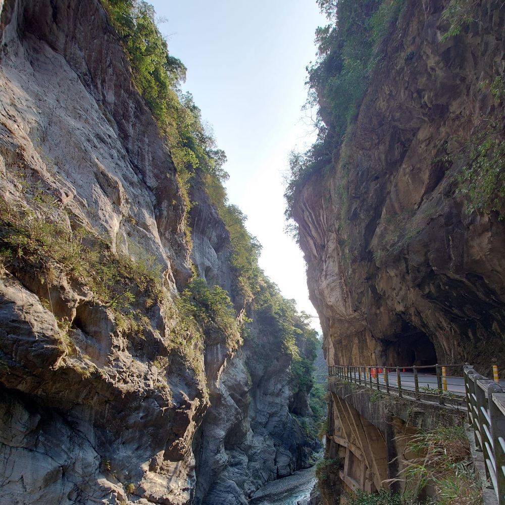 ▲ Between Taroko Swallow Grotto Trail and Tunnel of Nine Turns is a vertical, steep marble cliff, approximately 1,200 meters wide and 1,100 meters high. Across the stream from the highway is Zhuilu Old Trail, a deep, narrow, and vertical cliff formed by the Liwu River cutting through the ridge of Sanjiaozhui Mountain.