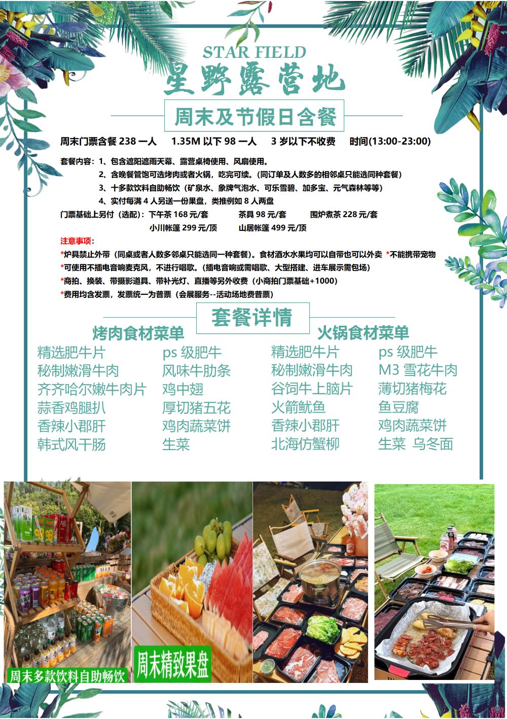 Admission ticket includes Sky Screen and outdoor tables & chairs on weekdays and weekends, with weekend price also including BBQ/Hot Pot (choose 1) and unlimited self-service drinks Tent rental does not include admission tickets, limited quantity available, advance booking required