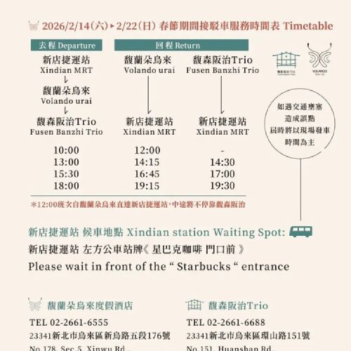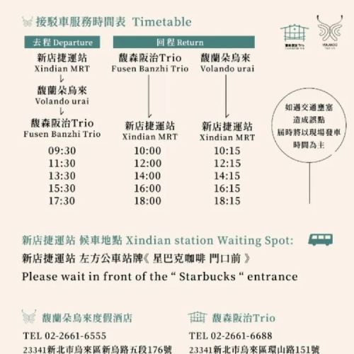 Available booking times within, or email your booking number to [service_bz@fusenpark.com.tw] to make a reservationWulai Fusen Banzhi Trio