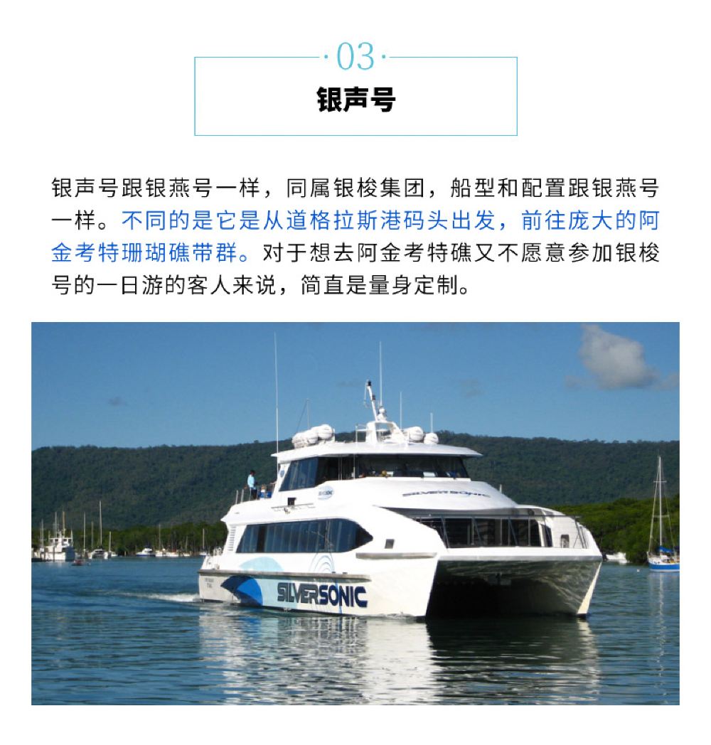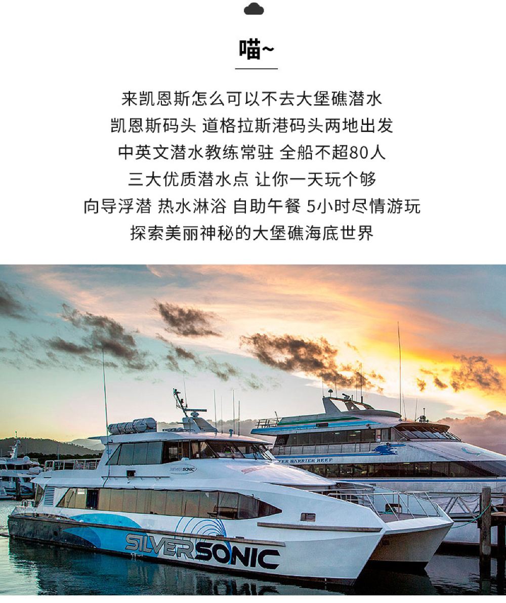 The Silver Sonic is a cruise designed for snorkeling and diving adventures, offering 5 hours of unlimited snorkeling. The Silver Sonic departs from Port Douglas to three different diving sites.