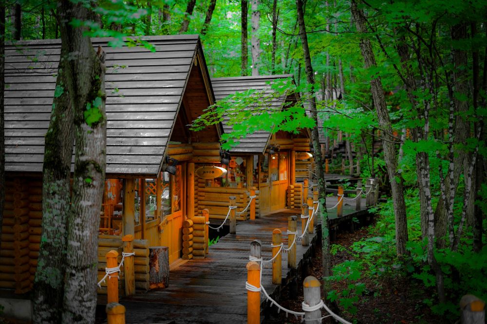 ▲ Forest Elf Terrace (Ninguru Terrace) is a forest walking path designed by writer Sō Kuramoto. Nestled in a dense forest, it features 15 unique log cabin-style craft shops. These charming wooden shops offer one-of-a-kind handmade goods, primarily focusing on nature-themed crafts, accessories, and souvenirs that embody the distinctive charm of Furano.