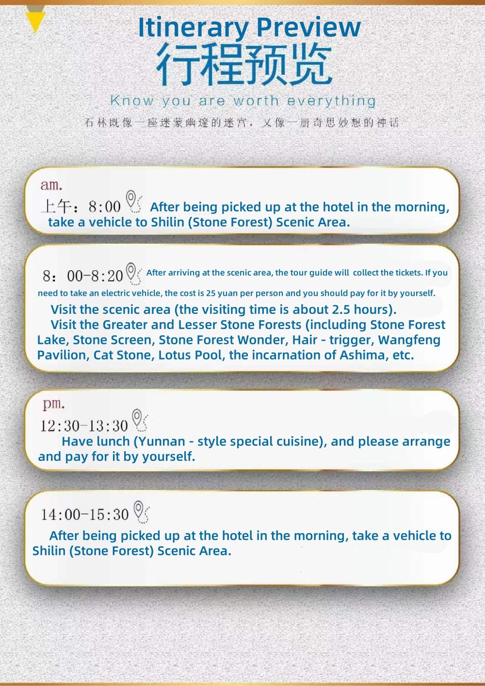 The scheduling was perfect. The person will call you to get your information and the next day, the driver will come pick you up on time. The tour guide will be from the Stone Forest.