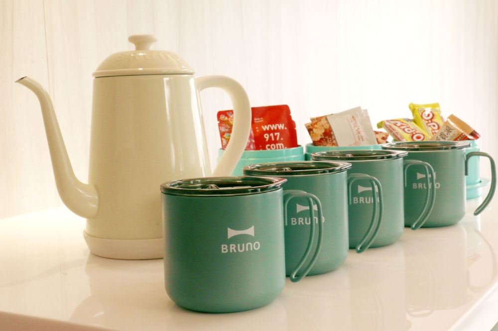 - Living room: TV, refrigerator (with drinks), air conditioning, sofa, pillows, mini snack bar, wooden floor, charging socket, electric kettle, teacup, trash can