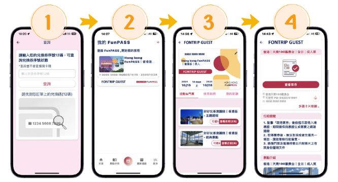 ④ Present the e-voucher in the HONG KONG FunPASS app at designated redemption counters of participating attractions or merchants, and have it redeemed by staff before use.