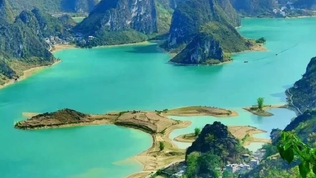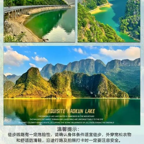 Haokun Lake Scenic Area is located in Lingzhan Township, Lingyun County, Baise City, Guangxi. It is a karst lake formed by the damming of the Chengbi River in the Pearl River basin. The lake covers an area of approximately 20 square kilometers, with a length of 6 km (extending to 15 km during the flood season). The crystal-clear waters are surrounded by unique limestone peaks. As a national 4A-level attraction and wetland park, its picturesque lake and mountain views, along with the karst landscape, are hailed as the "Guangxi version of Namtso Lake." Cen Yunhan, a Ming Dynasty chieftain, once left behind the timeless masterpiece "Travel Notes of Dong Lake" here.