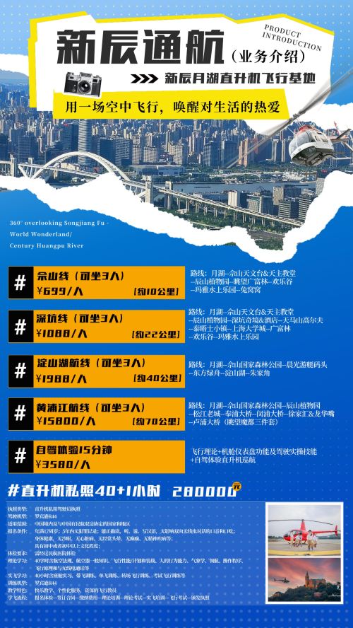 [Multiple Routes Available] Experience the Sheshan Route, Deep Pit Route, Dianshan Lake Route, Huangpu River charter flights, helicopter self-flying experiences, fixed-wing flights, and more!