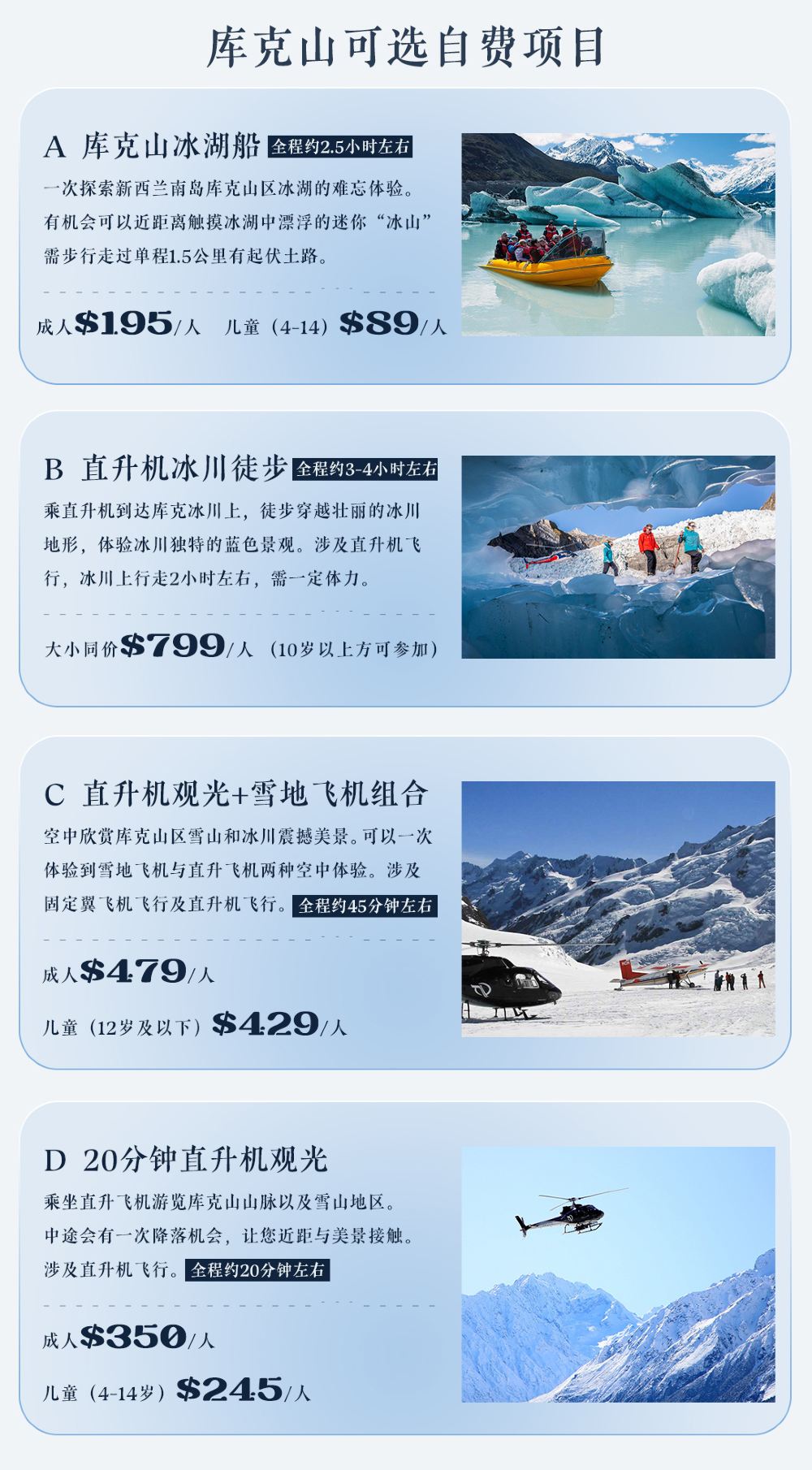 [Notice] Package B - Mount Cook Helicopter Sightseeing & Glacier Hike is only available for booking for ages 9 and above, with a maximum weight limit of 116kg.