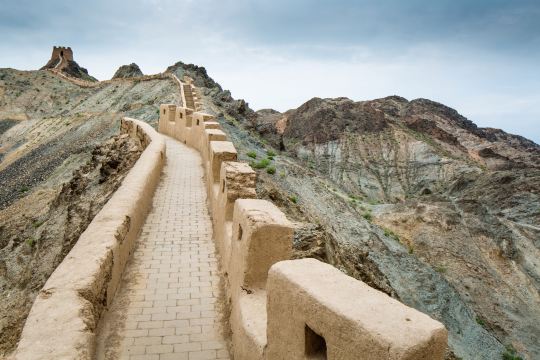 ▲ The Overhanging Great Wall Scenic Spot is located on the northern slope of Heishan Mountain, north of Shiguan Gorge, 8 km north of Guan City of Jiayuguan. In 1539 during the Ming Dynasty, to strengthen Jiayuguan's defenses, Li Han, the military commander of Suzhou, supervised the construction of a 15 km long wall made of stone slabs and compacted earth, starting from the mountain ridge south of the gorge beyond the hidden wall.