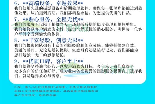 If you're concerned that the photographer's work may not meet your aesthetic preferences, you can check the photos in the camera every 5 minutes during the shoot to ensure they meet your expectations. Communicate any adjustments needed with the photographer. If after two rounds of communication (within 20 minutes) you're still unsatisfied, please promptly contact other staff members in the group to terminate the service for a refund or reschedule with another photographer to avoid greater losses for both parties. However, the photographer's transportation costs and admission ticket must be reimbursed (if applicable). If no objections are raised after the photo session, it will be considered satisfactory by default, and no refunds or photographer replacements will be provided.