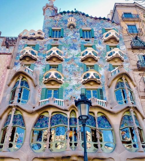 ▲ Casa Batlló • A strikingly unconventional apartment building located in Barcelona's Eixample district, representing the mature masterpiece of Spain's visionary architect Gaudí • The entire facade is adorned with colorful mosaics, while the roof resembles dragon scales, creating an atmosphere of fantasy throughout
