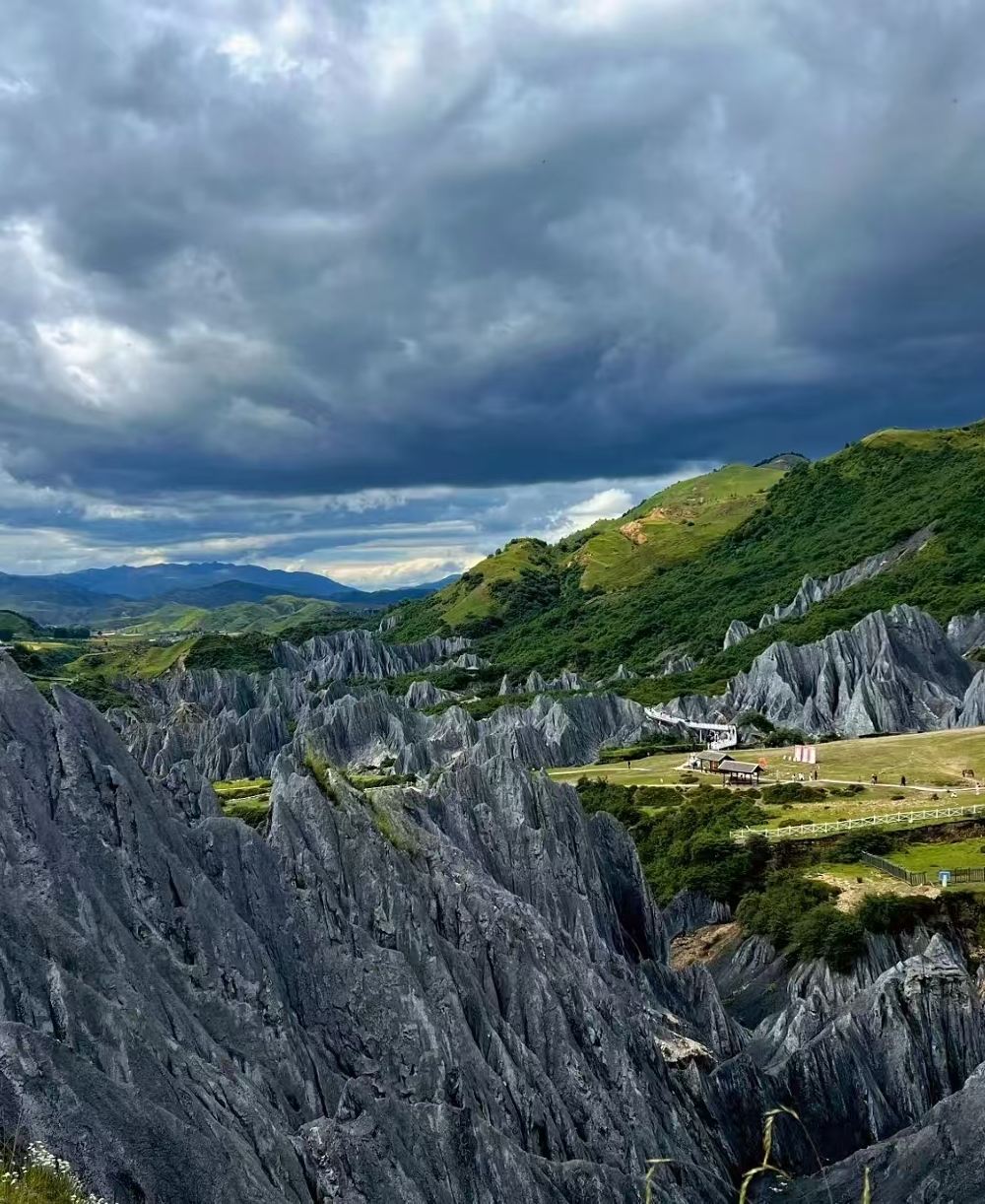 Moshi Stone Forest is a rare geological wonderland with dramatic black rock formations shaped by erosion and time. These jagged rocks create an otherworldly landscape, reminiscent of scenes from a sci-fi movie. It is a unique destination where you can explore the mysterious beauty of nature. The dark, towering rock formations stand in stark contrast to the surrounding green hills, offering a striking visual experience.