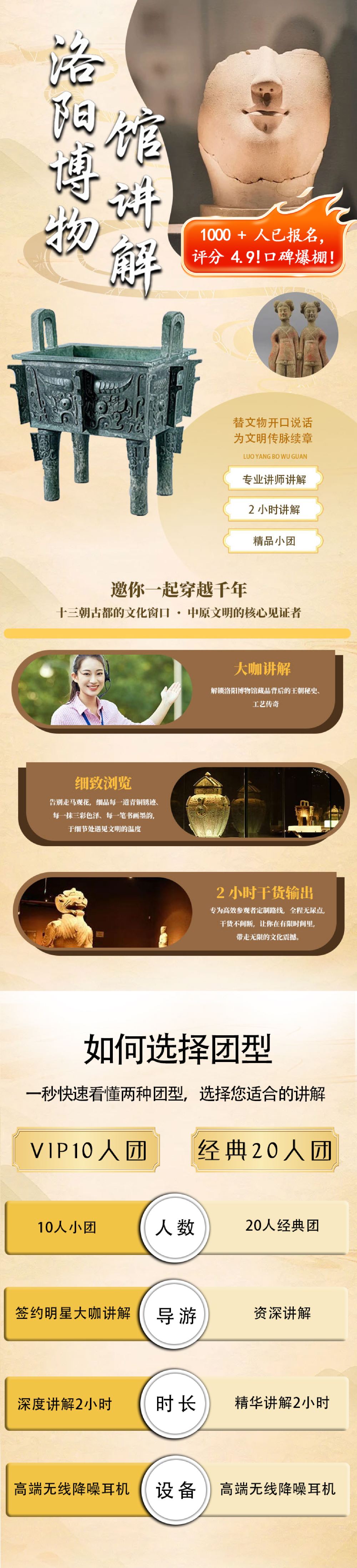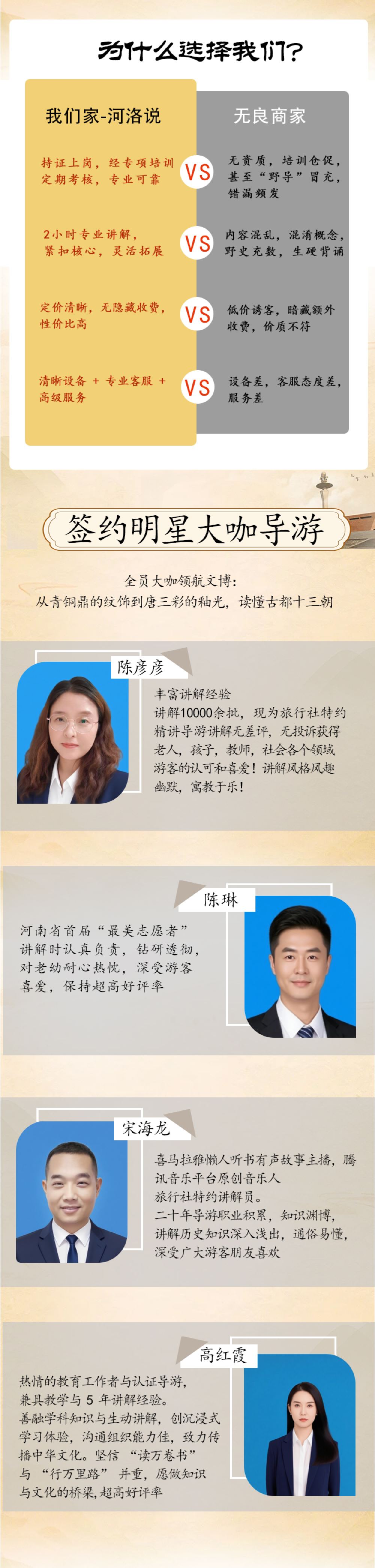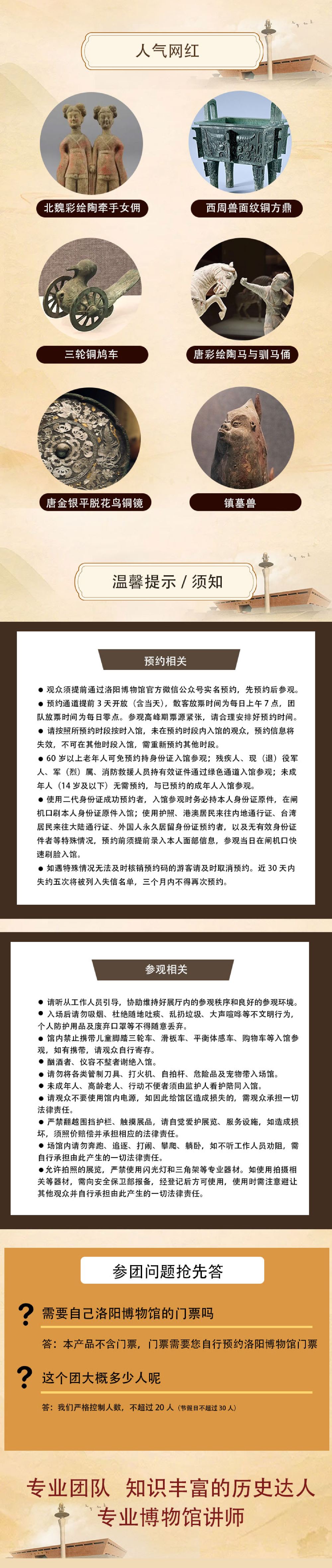 1. The guide will contact you via SMS or phone call the night before. Daily time slots: 9:30, 10:00, 11:00, 13:00, 14:30 (VIP Star Group with 10 travelers has four daily sessions: 9:30, 10:00, 11:00, 13:00, 14:30. Star Group travelers, please contact customer support to note your preferred time slot after booking). As this is a join-in tour, please arrive at Luoyang Museum 10 minutes before your selected time slot. Being late for more than 20 minutes will be considered as forfeiting the tour, and no refunds will be issued. Thank you for your understanding!
