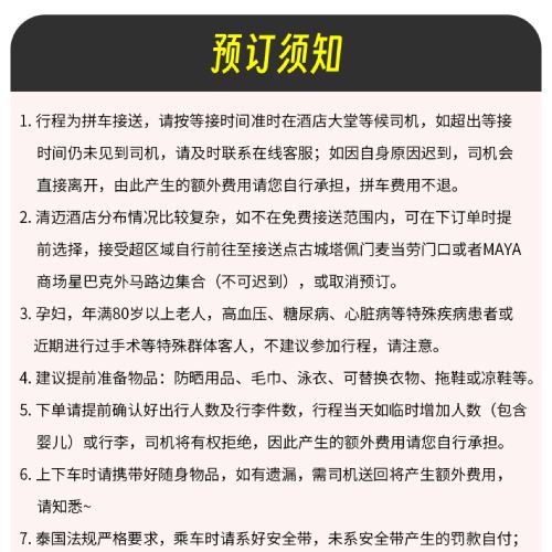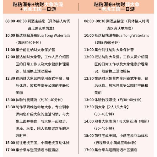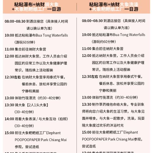 For this itinerary, only the CHOKCHAI ELEPHANT CAMP ปางช้างโชคชัย (Elephant Camp) attraction provides Chinese guide services. The rest of the itinerary is for free exploration. If you have any questions about the arrangements, feel free to contact our customer support. Guests who may have concerns are advised to book with caution.