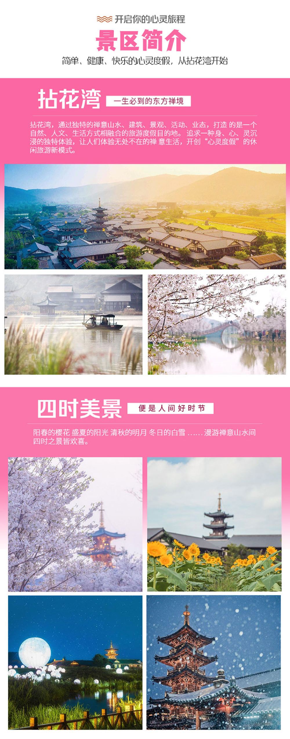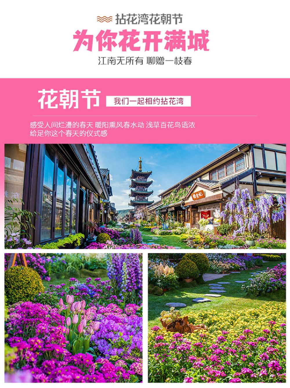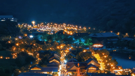 Nianhua Bay blends the gentle charm of Jiangnan water towns with Zen tranquility. Small bridges arch over flowing streams while flower shadows sway, and time seems to slow along the cobblestone paths. By day, breezes ripple through seas of blossoms, carrying refreshing fragrances; by night, lantern lights shimmer on water as Buddhist chants whisper, creating a dreamlike fairyland. Here, you can leave the noise behind, listen to flowers blooming in silence, and embrace inner peace and serenity.