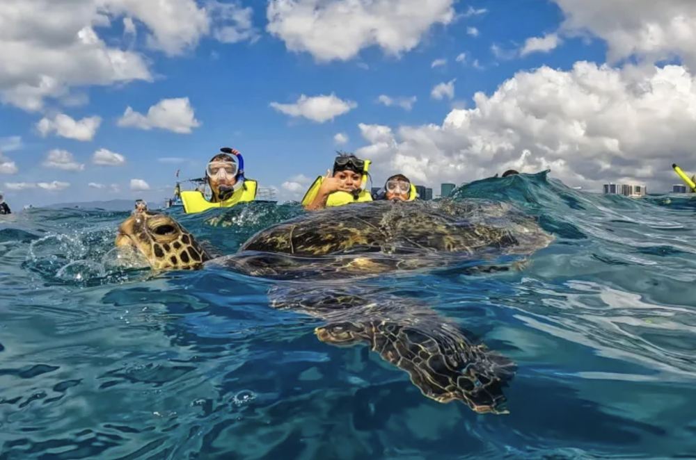 ▲ Cruise along the Honolulu coastline on your way to Oahu's #1 turtle snorkeling location, Turtle Canyon! On this tour, you'll have the opportunity to swim with Hawaiian green sea turtles, colorful reef fish, and more!