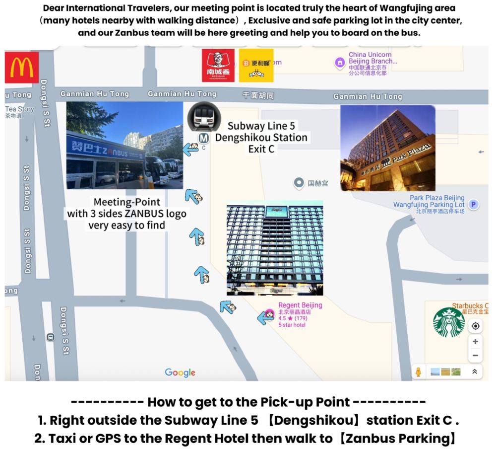 ▲ Our meeting-point is located truly the heart of Wangfujing area (many hotels nearby with walking distance) and our Meet-up location is very clear with 3 sides ZANBUS logo and very easy to find in Beijing, You won't miss it.
