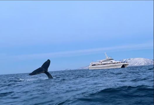 Experience the Tromso whale-watching tour aboard the MS Gabriele catamaran for a fast and comfortable journey to observe whales up close. Head to the prime locations where whales gather to feed on herring. Enjoy whale watching through the large windows in the cozy cabin or get an even closer view from the open-air deck. You may have the chance to spot orcas and humpback whales, while fin whales, minke whales, and sperm whales are also frequently seen in the waters near Tromso. A professional guide will lead the group through the Arctic scenery while sharing fascinating whale facts. The tour lasts 6-8 hours, depending on the whales' location—extending to 8 hours if they are farther away to maximize sighting opportunities. The warm and comfortable catamaran ensures every passenger has a seat, with hot and cold beverages, snacks, and light meals available for purchase onboard.