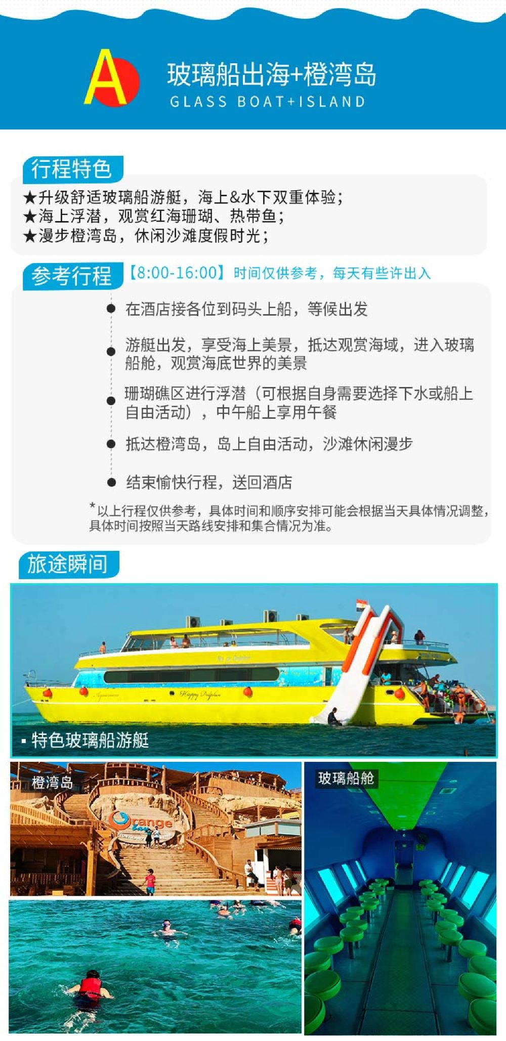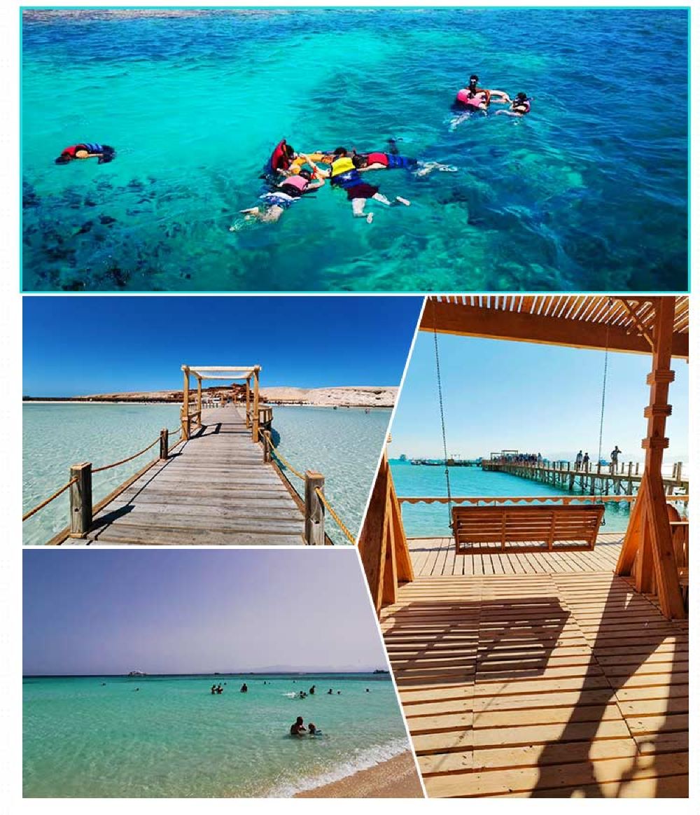 Egypt Red Sea day tour with glass boat, snorkeling yacht, glass boat, beach islands, and coral reefs
