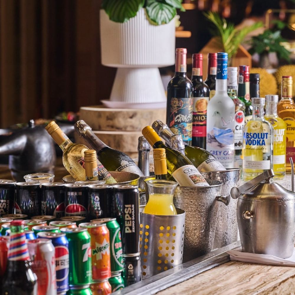 11. Beverages: CAVA sparkling wine, red and white wine, imported spirits, beer, Chang soda water, pineapple beer, chilled juice, Pepsi, 7-Up, Mirinda