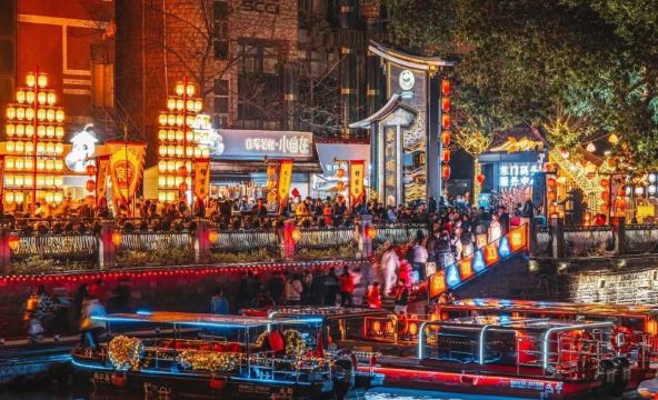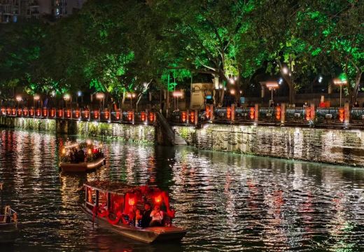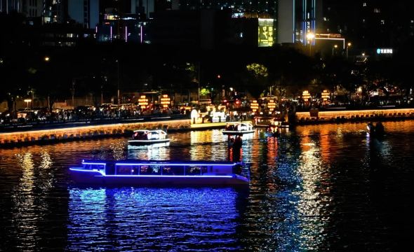Set sail on a cruise and enjoy a dazzling journey featuring Dongmen Wharf's video show, folk music at the Music Square Wharf, the December Market light show, sailing boat performances, and Hejiang Pavilion's curtain projection show. Along the way, explore Chengdu's iconic nightlife landmarks like Lan Kwai Fong, Hejiang Pavilion, Anshun Covered Bridge, and the bar street. Be entertained by riverside performances inspired by poets Li Bai and Du Fu, Xue Tao, gong-beating attendants, and flute players on the water. The wharf also hosts a vibrant market with Chengdu's specialty foods, dining options, cultural creative products, and charming nighttime photo spots. The 3.5km route takes approximately 30 minutes.