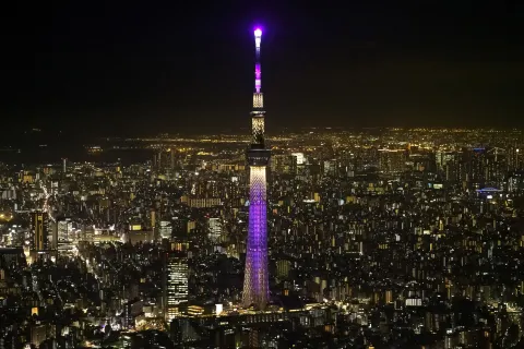Enjoy the colorful light show at Tokyo Skytree at night