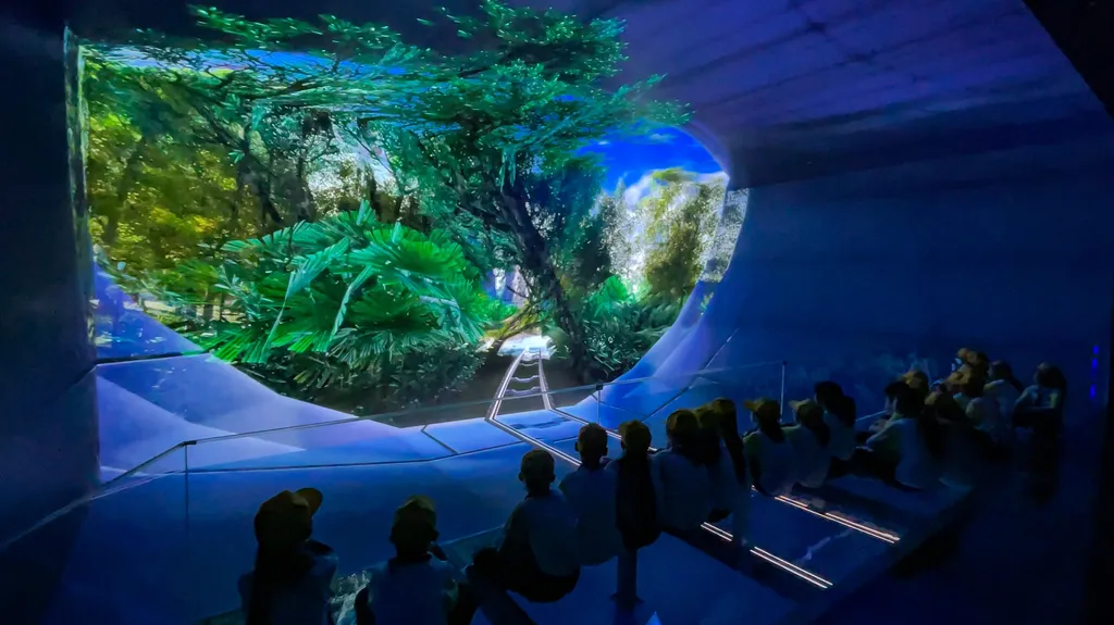 The overall spatial design follows the natural slope of the terrain, seamlessly blending with the surrounding environment like two soaring dragons reaching for the sky. For visitors' experience, they can board the magic carpet ride for effortless transportation. As the flying carpet ascends at a steady pace, it offers a smooth and comfortable viewing experience. Mysterious stone pillars and statues peek through the jungle along the way, allowing guests to immerse themselves in breathtaking scenery without moving a step.