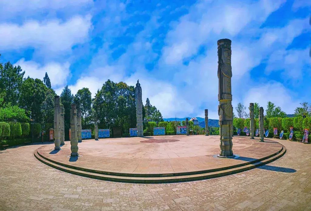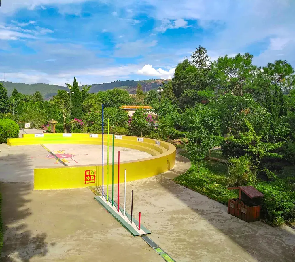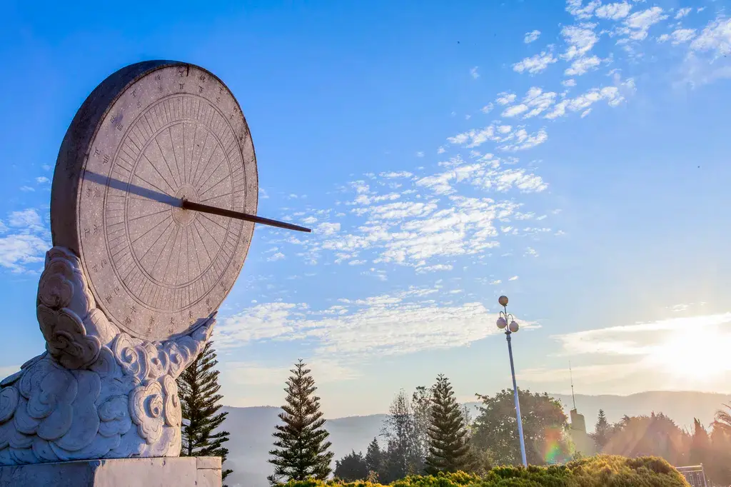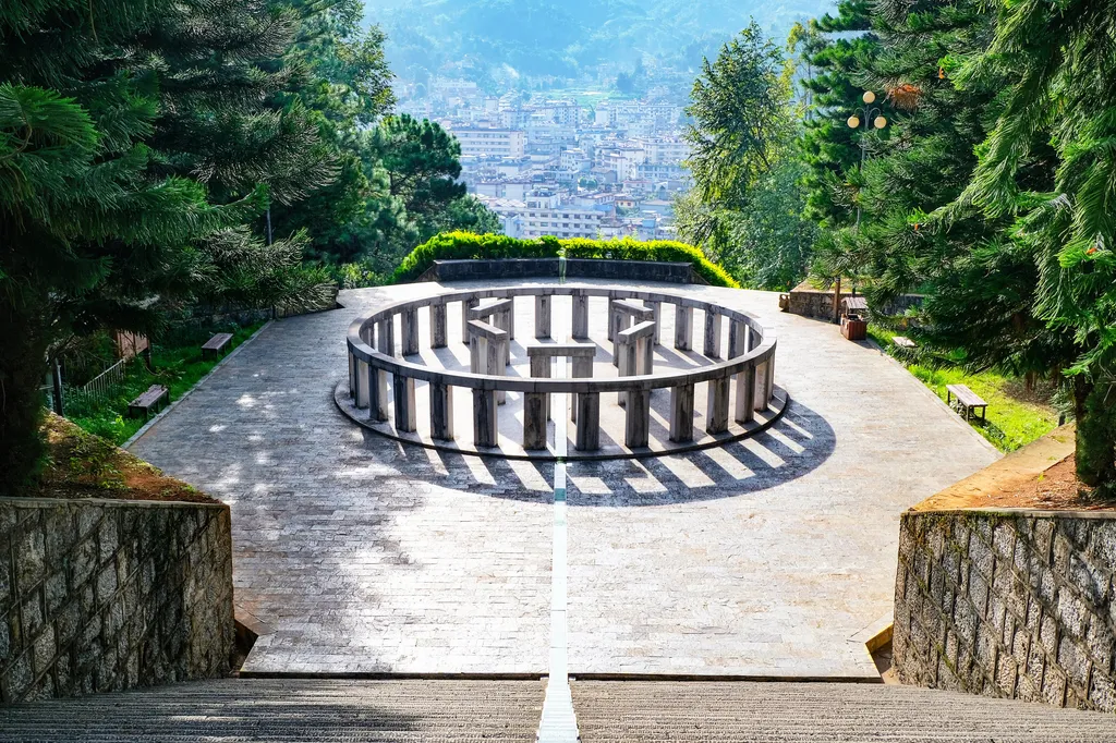 The square features a sundial for measuring the 24 solar terms, composed of 12 stone pillars of varying heights and shapes, representing the 12 months of the year. A metal sphere atop the southernmost pillar casts a shadow that moves precisely along a crimson line at noon, allowing accurate determination of the solar terms. These 12 pillars also symbolize the unity and harmony of the 12 Hani ethnic subgroups living in the magical oasis of the Mojiang Tropic of Cancer Symbol Park.