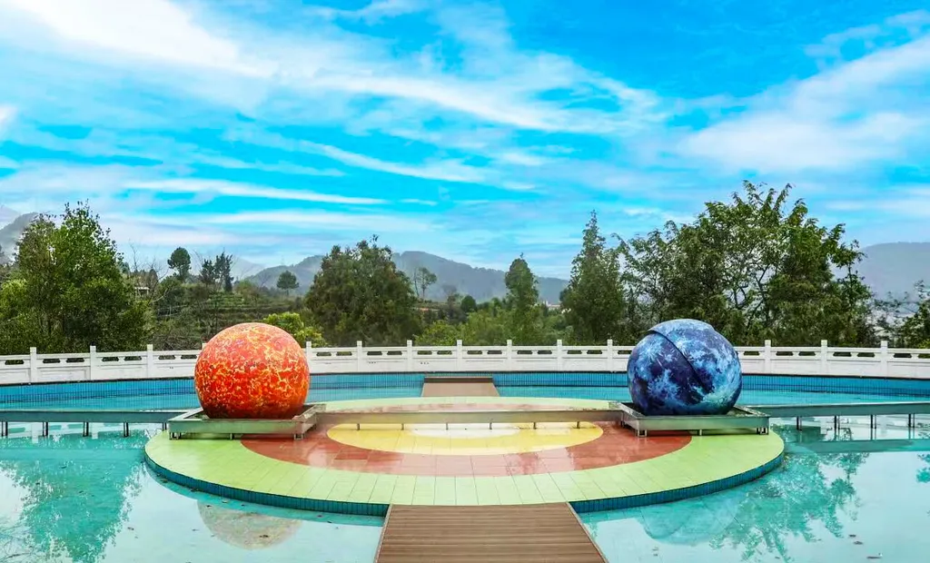 At the center of the pool stand two marble spheres, each weighing 16 tons, representing the sun and moon. Every 60 years during the jiazi cycle, when the sun, moon, and earth align in their orbits and rotations, a unique phenomenon occurs in Mojiang. Here, the moon begins to rise before the sun fully sets. Under the simultaneous illumination of sunlight and moonlight, these two marble spheres cast intersecting shadows in opposite directions, creating the breathtaking "sun and moon shining together" view.
