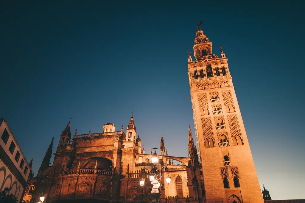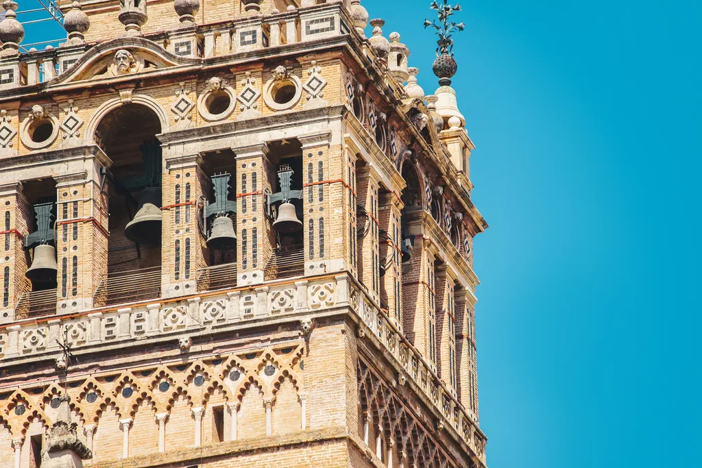 Seville Cathedral (Catedral de Santa María de la Sede) is the third largest cathedral in the world⚖️ and one of the largest Gothic religious buildings in Europe. Its predecessor was a 12th-century mosque, which was rebuilt to combine the essence of Islamic and Christian art. The iconic building **La Giralda** retains Moorish geometric carvings. Climbing to the top, you can overlook the panoramic view of Seville. The slope inside the tower was originally designed to facilitate horseback riding.